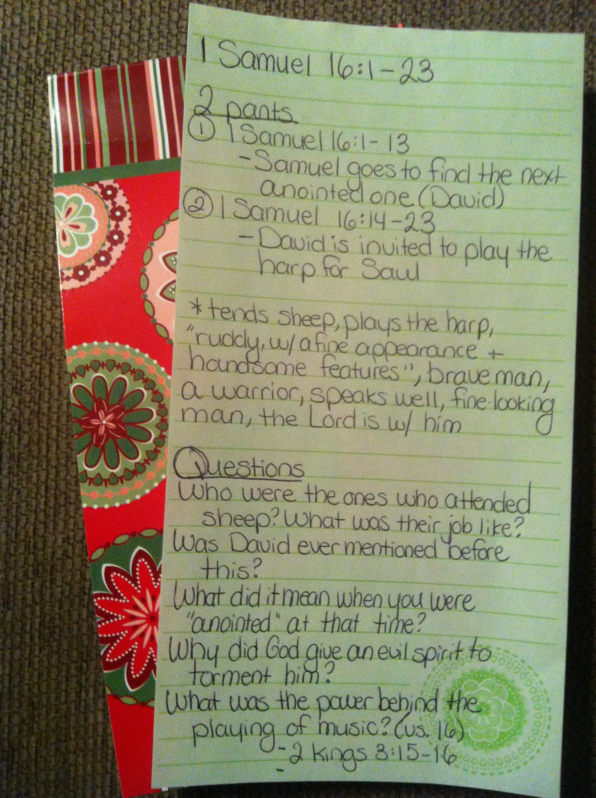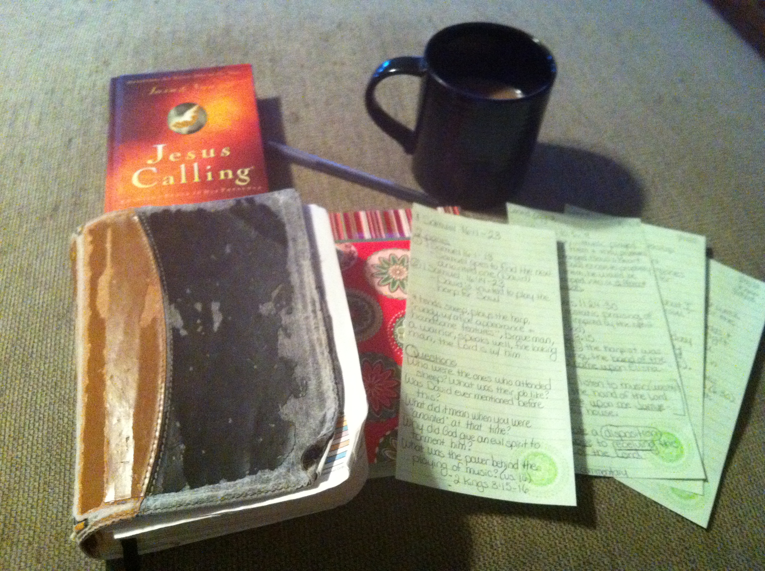 This is what my notes looked like and what I used for the study. And the picture up above is what my “display” looked like (6 oz. of coffee with fat free milk..my treat for the day!, my Bible, a pen, and a cheap notepad because I ran out of pages in my spiral notebook, & the Jesus Calling book by Sarah Young.)
