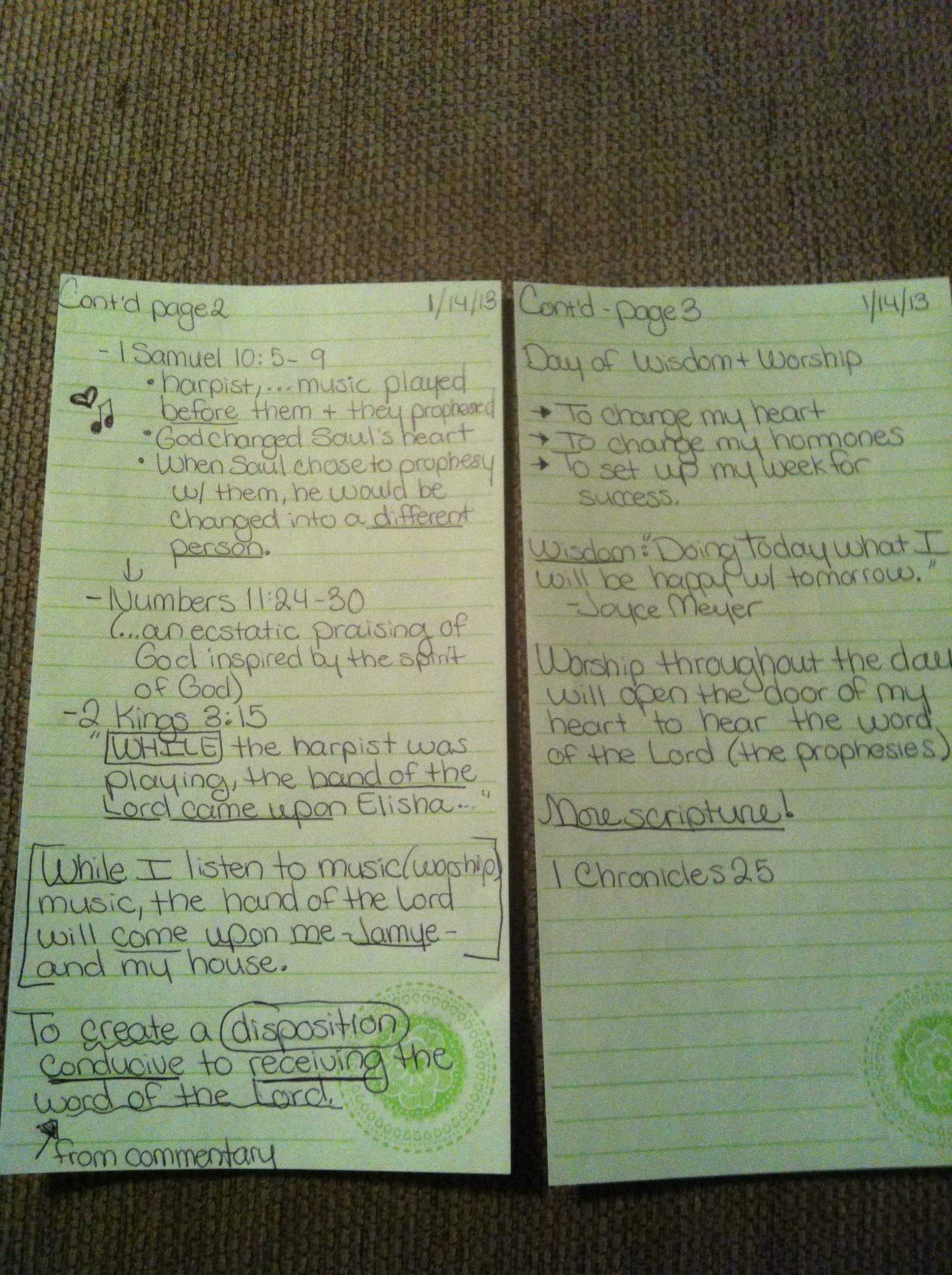 After spending time studying the Word (even though I didn’t really want to at first), I walked away with TREASURE for my day. This was my command and reward for yesterday: Worship & Wisdom. Worship throughout the day will OPEN the door of my heart to hear the word of the Lord (the prophesies from Him), change my disposition, give me a happy heart and a happy home.