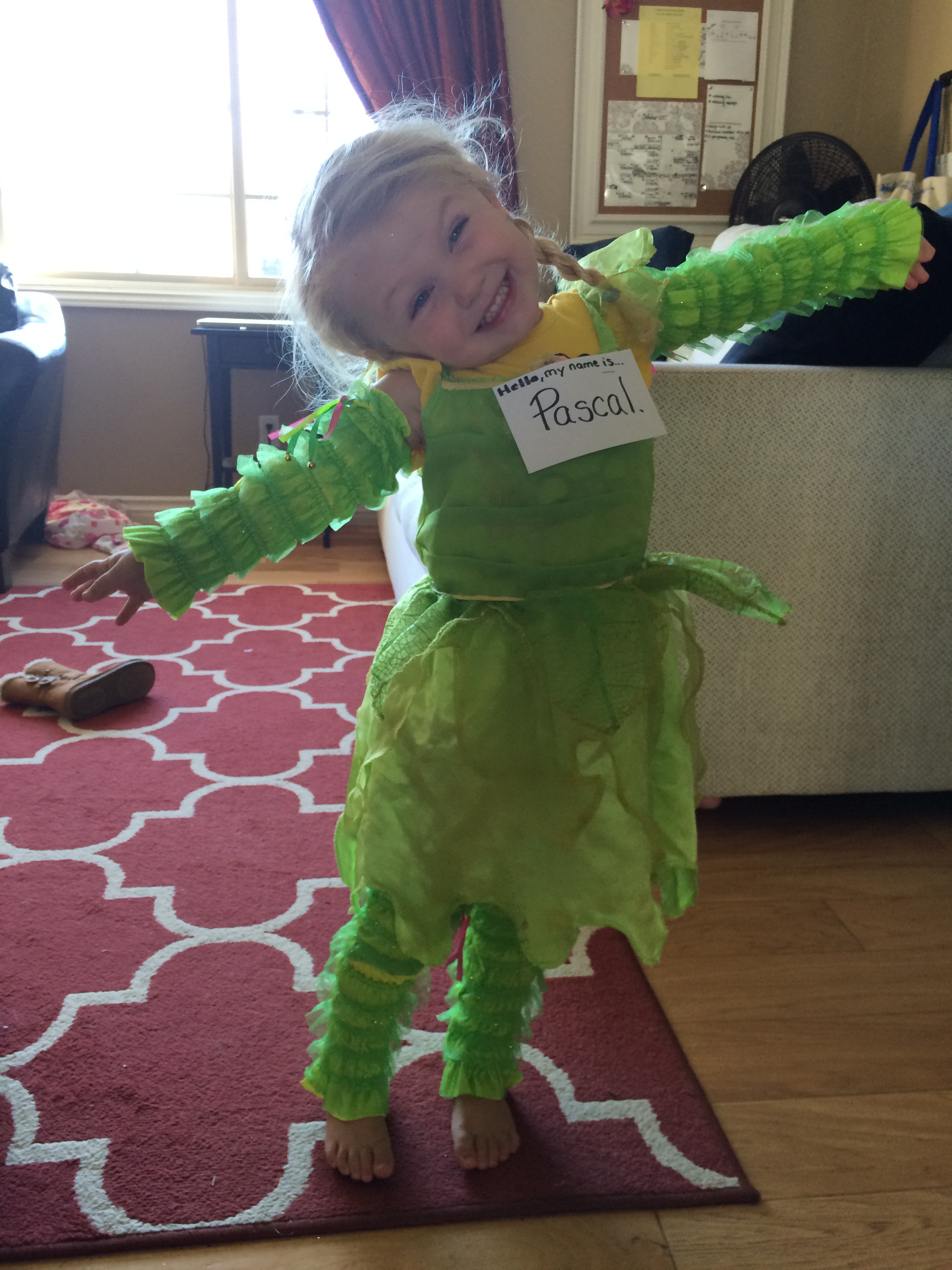 (Shyloh’s “Pascal” Costume is actually a Tinkerbell costume we had.  I just covered it up with an index card and leg coverings for her arms and legs.  ….  we just have to use our imagination! lol)